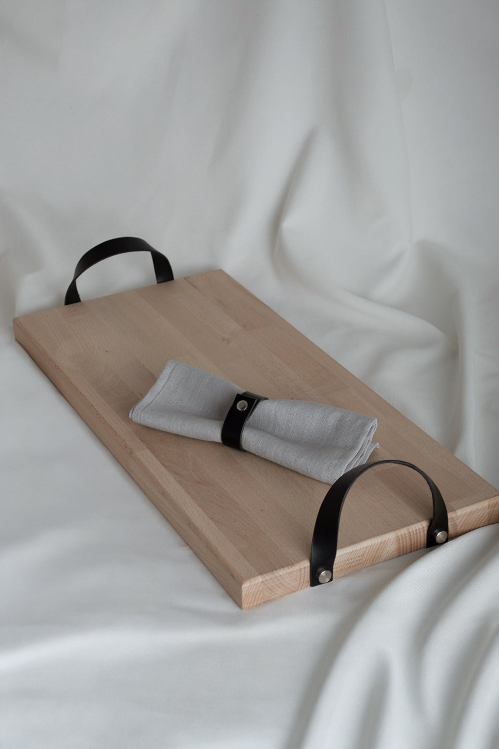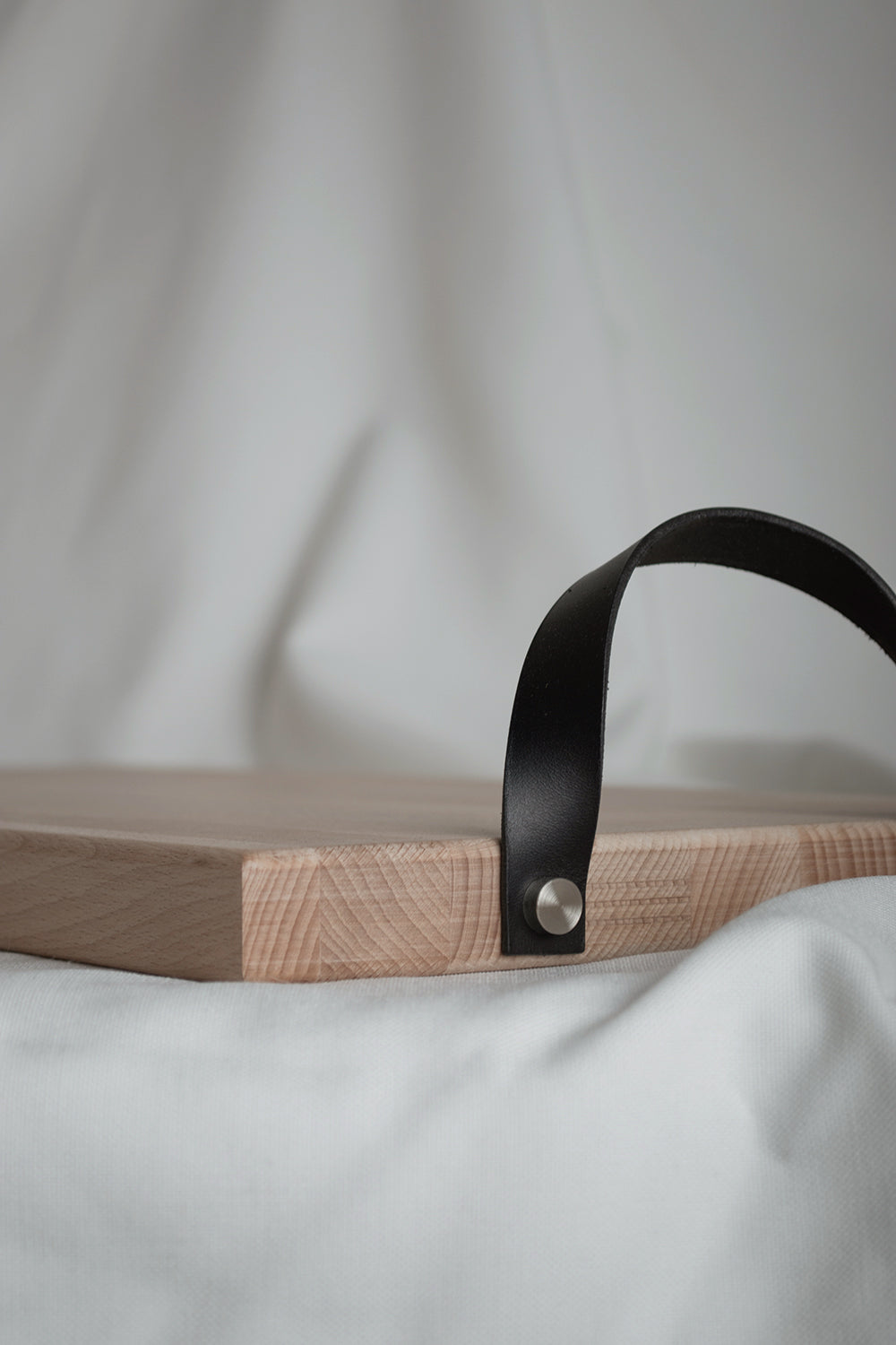 Buchenholz, Leder (vegetabil gegerbt), Edelstahl